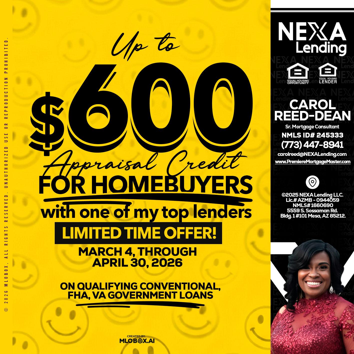 https://wp-premieremortgagemaster.s3.amazonaws.com/wp-content/uploads/2026/04/15124600/CAROL-REED-20.jpg 1417 1417 Carol Dean https://wp-premieremortgagemaster.s3.amazonaws.com/wp-content/uploads/2025/11/26042347/NEXA-Lending-new-logo-copy-copy.png Carol Dean2026-04-15 12:46:032026-04-15 12:46:03UP TO 600