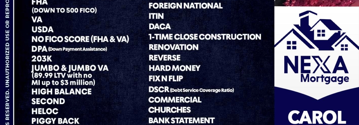 Hi, my name is Carol Dean. I’m a Loan Officer with NEXA Mortgage LLC., offering personalized mortgage solutions, fast customized quotes, great rates and service with integrity.